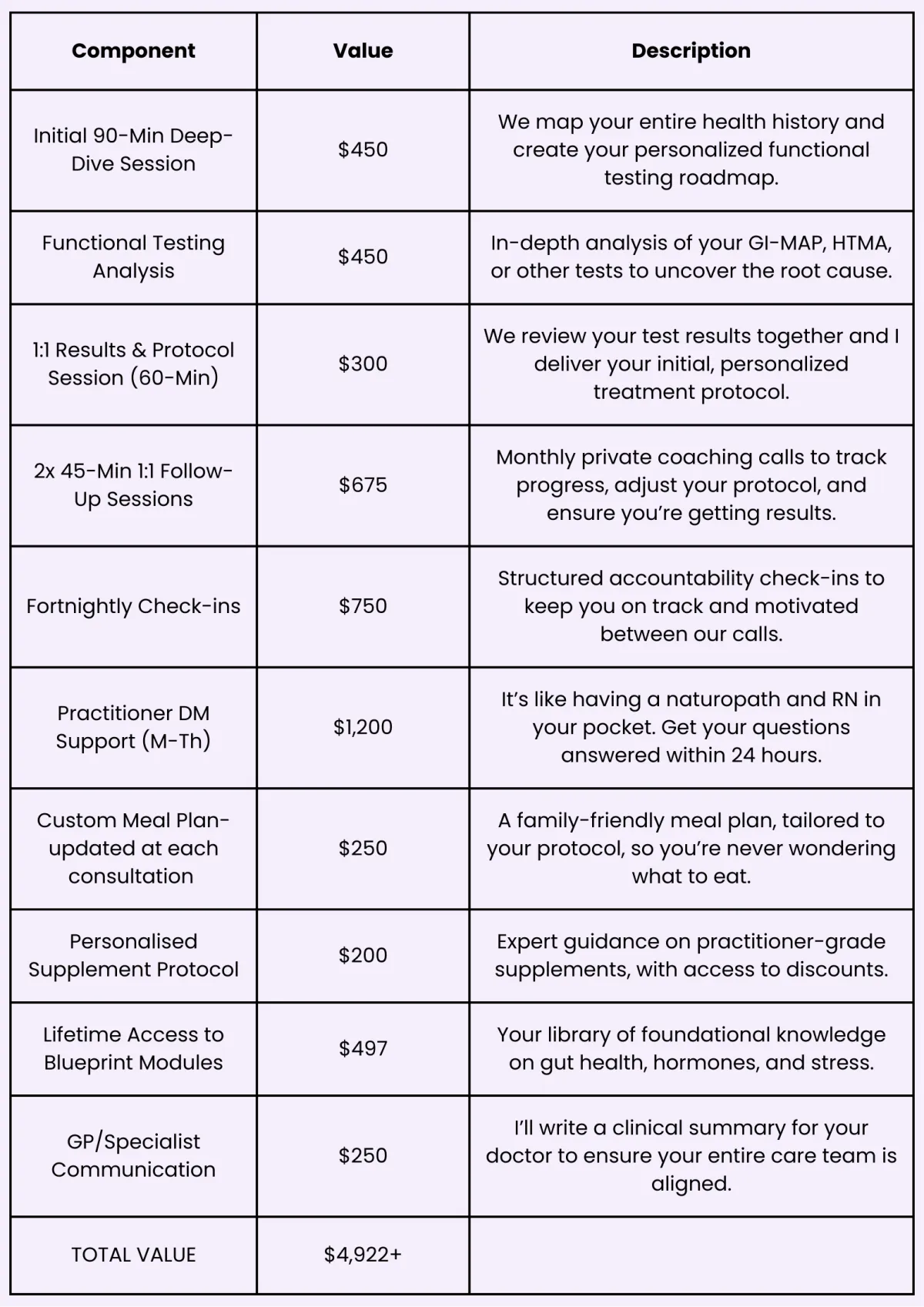 No. Testing and supplements are additional costs as they are 100% personalised to you. We only recommend what is absolutely necessary, and you will get access to my practitioner discount on supplements.